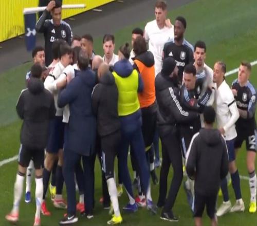 这次群架的导火索,在于比赛第85分钟,当时热刺已经1-2落后,心态失衡的帕利尼亚,在边线附近一次毫无必要的“废人”式飞铲,掀翻了罗杰斯。后者痛苦倒地打滚,看到爱徒遭到恶劣侵犯,场边的维拉主帅埃梅里,愤怒摊手抗议。
