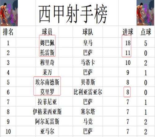 射手榜方面,姆巴佩18球继续领跑,托雷斯11球位列第2,穆里奇10球排在第3,莱万9球位列第4。莫里罗今天传射建功,追上埃尔南德斯,两人8球并列第5。拉菲尼亚,亚马尔和阿尔瓦雷斯等人7球刚好挤入前十。