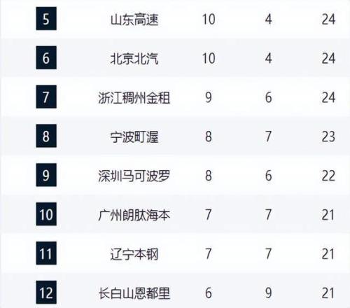 黑马青岛队以80-67轻松击败吉林队,收获3连胜,战绩来到11胜4负,成功重返积分榜前4,展现复苏势头。山东队则是主场以大比分战胜另一匹黑马宁波队,战绩变成10胜5负,升至积分榜第5位;北京队10胜4负紧随其后,排名第六。浙江队9胜6负排第七,宁波队8胜7负跌至第八,深圳队8胜6负位列第九。
