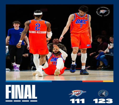 北京时间1月30日,雷霆客场111-123惨败森林狼无缘连胜,这场比赛首节森林狼就领先12分,第三节打完森林狼拉开到16分,末节戴姆波特还是常规轮换没有让SGA直接登场追分,等SGA再登场已经无力回天。