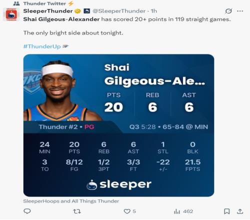 这场比赛SGA延续了连续119场20+的纪录,他距离张伯伦连续126场20+的纪录只差7场,这场比赛SGA真的是被迫背锅的。